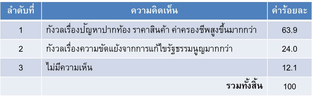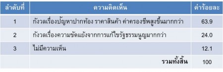 ที่น่าพิจารณาคือ เมื่อถามถึงความกังวลต่อเรื่องสองเรื่องคือ กังวลต่อความขัดแย้งจากการแก้ไขรัฐธรรมนูญ กับความกังวลเรื่องปัญหาปากท้อง ราคาสินค้า ค่าครองชีพที่สูงขึ้น พบว่า ส่วนใหญ่หรือร้อยละ 63.9 กังวลเรื่องปัญหาปากท้อง ราคาสินค้า ค่าครองชีพที่สูงขึ้นมากกว่า ในขณะที่ร้อยละ 24.0 กังวลเรื่องความขัดแย้งจากการแก้ไขรัฐธรรมนูญมากกว่า และร้อยละ 12.1 ไม่มีความเห็น และที่น่าเป็นห่วงคือ ส่วนใหญ่หรือร้อยละ 61.8 รับรู้ต่อข่าวรัฐบาลในการแก้ไขปัญหาปากท้อง ค่าครองชีพของชาวบ้าน ค่อนข้างน้อยถึงไม่รับรู้รับทราบเลย ในขณะที่ ร้อยละ 38.2 รับรู้ค่อนข้างมากถึงมากที่สุด