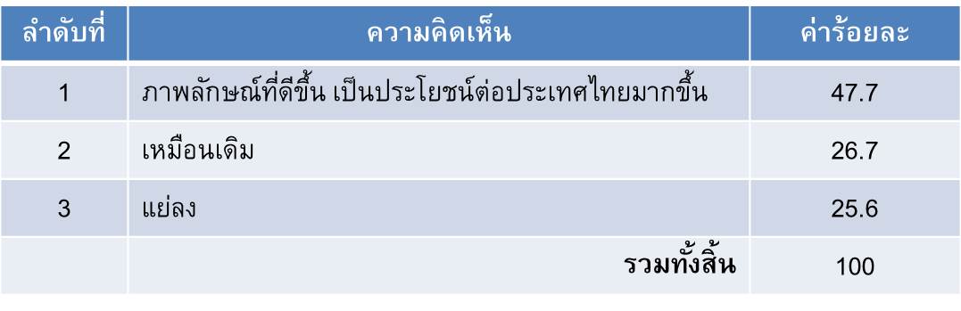 ที่น่าสนใจคือ เมื่อถามถึงความคิดเห็นต่อภาพลักษณ์ของ พ.ต.ท.ดร.ทักษิณ ชินวัตร ในข้อมูลข่าวสารที่รับรู้ช่วงนี้ พบว่า ร้อยละ 47.7 ระบุภาพลักษณ์ดีขึ้น เป็นประโยชน์ต่อประเทศไทยมากขึ้น ในขณะที่ร้อยละ 26.7 ระบุเหมือนเดิม และร้อยละ 25.6 ระบุแย่ลง