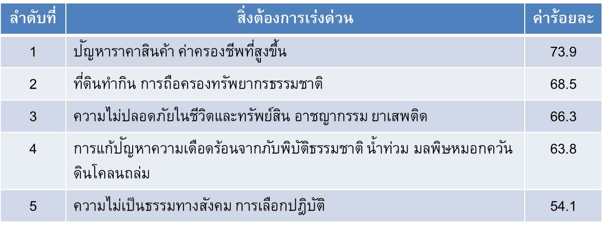 สำหรับสิ่งที่ต้องการให้รัฐบาลชุดปัจจุบันดำเนินการเร่งด่วนใน 5 อันดับแรก พบว่า ส่วนใหญ่หรือร้อยละ 73.9 ต้องการให้แก้ปัญหาราคาสินค้า ค่าครองชีพที่สูงขึ้น รองลงมาคือ ร้อยละ 68.5 ต้องการให้เร่งแก้ไขเรื่องที่ทำกิน การถือครองทรัพยากรธรรมชาติ ในขณะที่อันดับที่สาม ร้อยละ 66.3 ระบุความไม่ปลอดภัยในชีวิตและทรัพย์สิน อาชญากรรมและยาเสพติด อันดับที่สี่ ได้แก่ ร้อยละ 63.8 ระบุการแก้ปัญหาความเดือดร้อนจากภัยพิบัติทางธรรมชาติ เช่น น้ำท่วม มลพิษหมอกควัน และดินโคลนถล่ม ส่วนอันดับที่ห้า ได้แก่ ร้อยละ 54.1 ระบุเป็นเรื่องความไม่เป็นธรรมทางสังคม