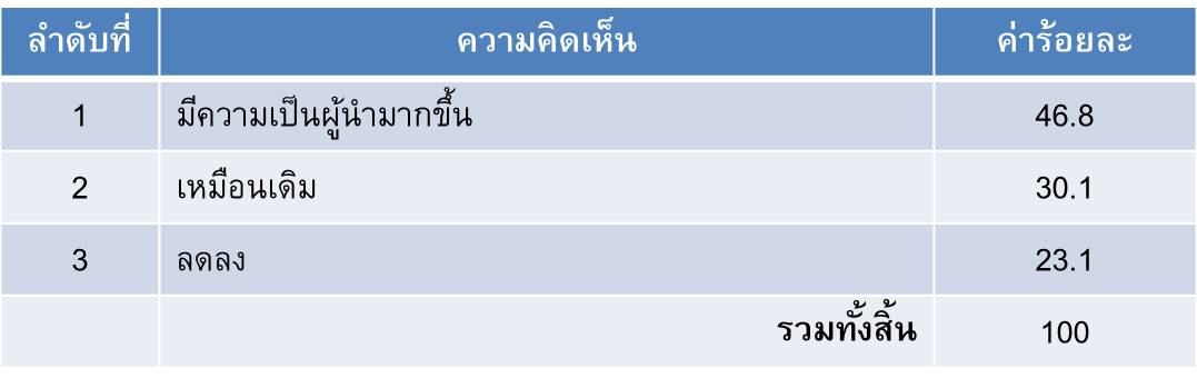 ตารางที่ 2 แสดงค่าร้อยละของตัวอย่างที่ระบุ ความเป็นผู้นำของนายกรัฐมนตรีหญิง ยิ่งลักษณ์ ชินวัตร