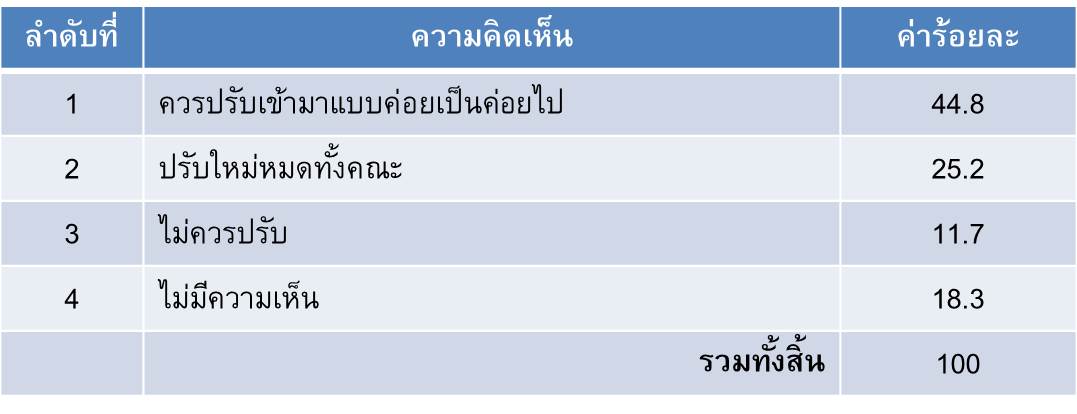 ตารางที่ 4 แสดงค่าร้อยละของตัวอย่างที่ระบุ รูปแบบที่ควรจะเป็นในการปรับคณะรัฐมนตรีโดยเปิดโอกาสให้กลุ่มแกนนำนักการเมืองผู้สนับสนุน พ.ต.ท.ดร.ทักษิณ ชินวัตร ที่เคยถูกตัดสิทธิทางการเมือง (กลุ่มบ้านเลขที่ 111) กลับมาเป็นรัฐมนตรี