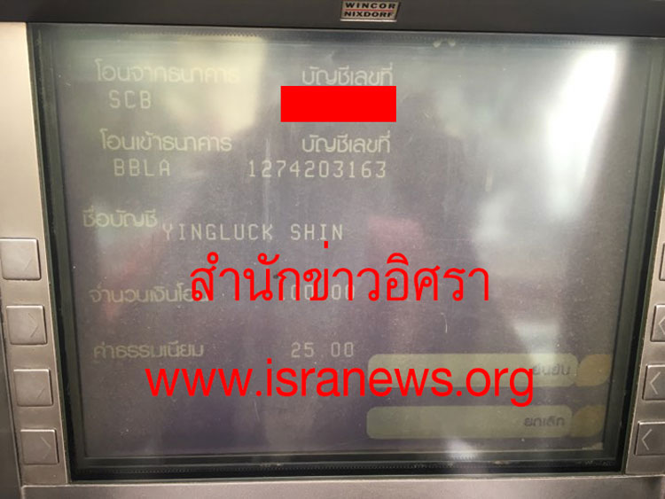 ผู้สื่อข่าวสำนักข่าวอิศรา www.isranews.org ได้สุ่มตรวจโอนเงินเข้าบัญชีเงินฝากของ น.ส.ยิ่งลักษณ์ ที่แจ้งไว้ในบัญชีแสดงรายการทรัพย์สินและหนี้สินต่อคณะกรรมการป้องกันและปราบปรามการทุจริตแห่งชาติ (ป.ป.ช.) กรณีพ้นจากตำแหน่งครบ 1 ปี เมื่อวันที่ 7 พ.ค. 2558 ด้วยวิธีการใช้บัตรกดเงินสดอัตโนมัติ (ATM) โอนผ่านตู้ ATM