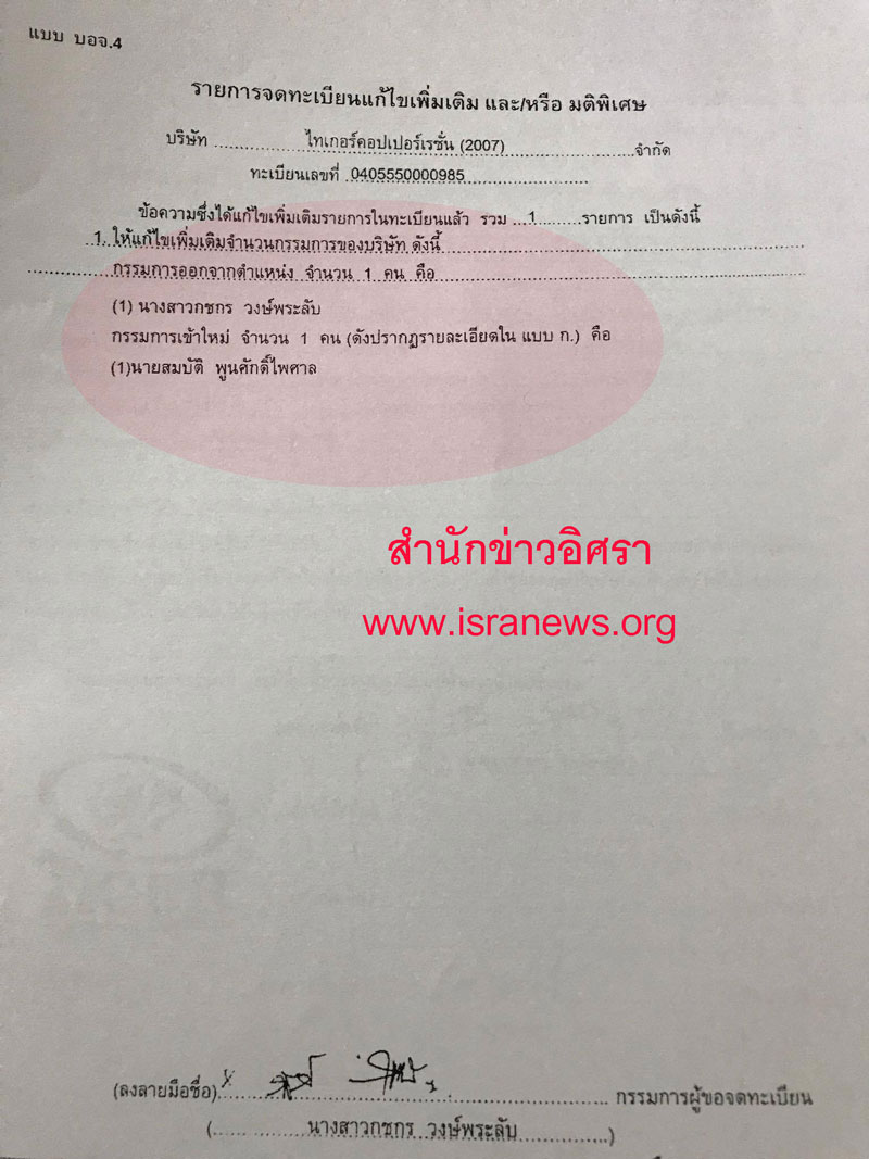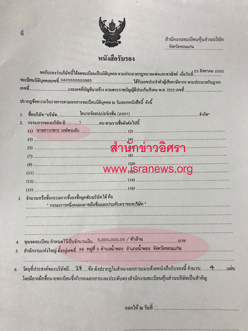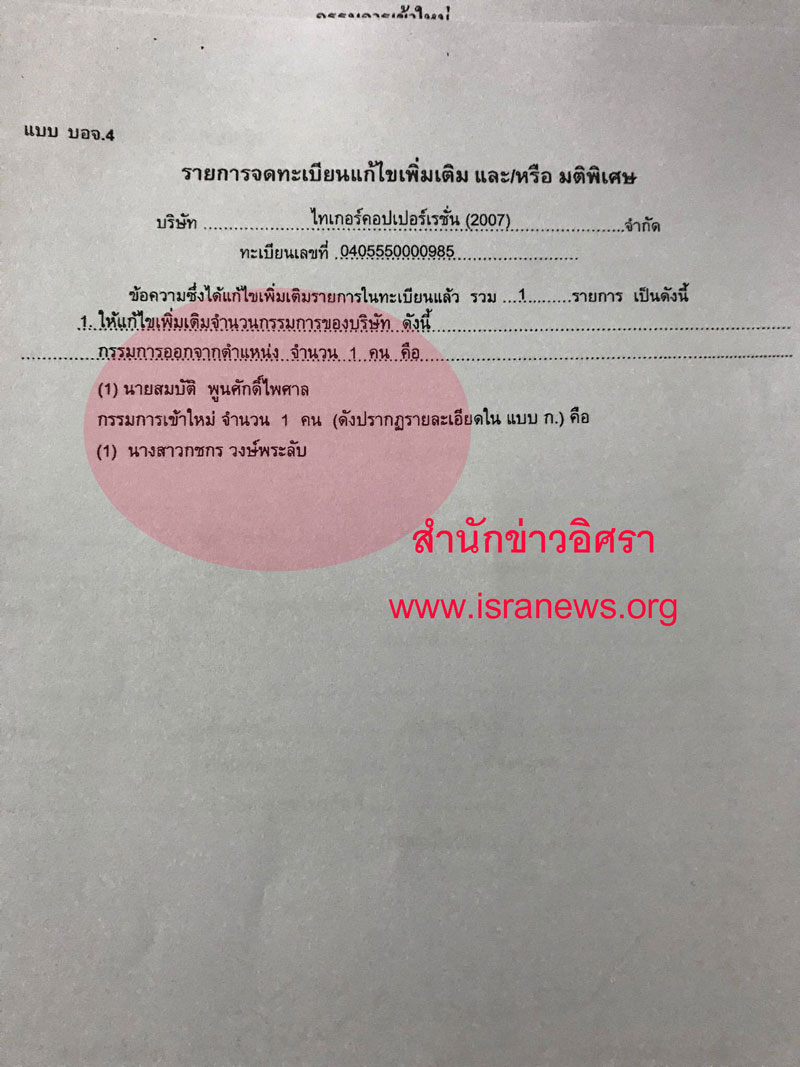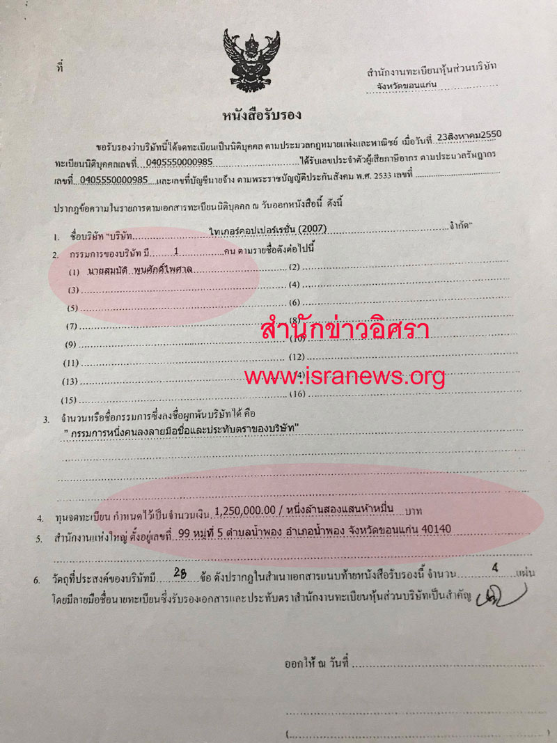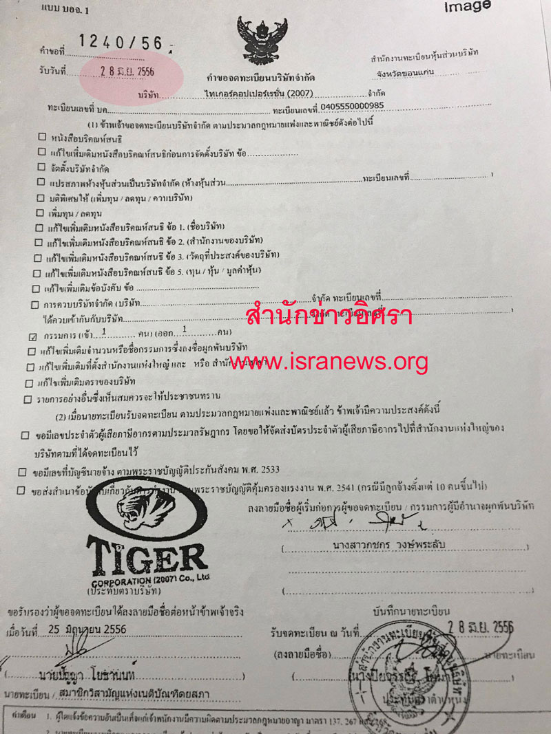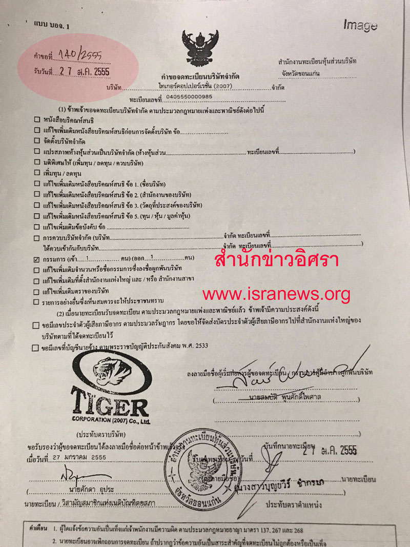 ล่าสุด สำนักข่าวอิศรา www.isranews.org ตรวจสอบเอกสารหลักฐานการจดทะเบียนจัดตั้งบริษัท ไทเกอร์ คอปเปอร์เรชั่น (2007) จำกัด ที่แจ้งไว้ต่อกรมพัฒนาธุรกิจการค้า