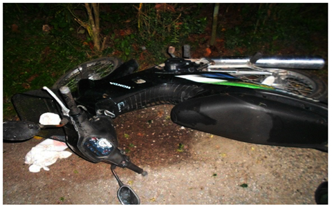 บรรยายภาพ : รถจักรยานยนต์ของ อส.อาซัน สาและ ที่ล้มคว่ำหลังเจ้าตัวถูกลอบยิงบริเวณใต้ถุนบ้านใน อ.เมืองยะลา