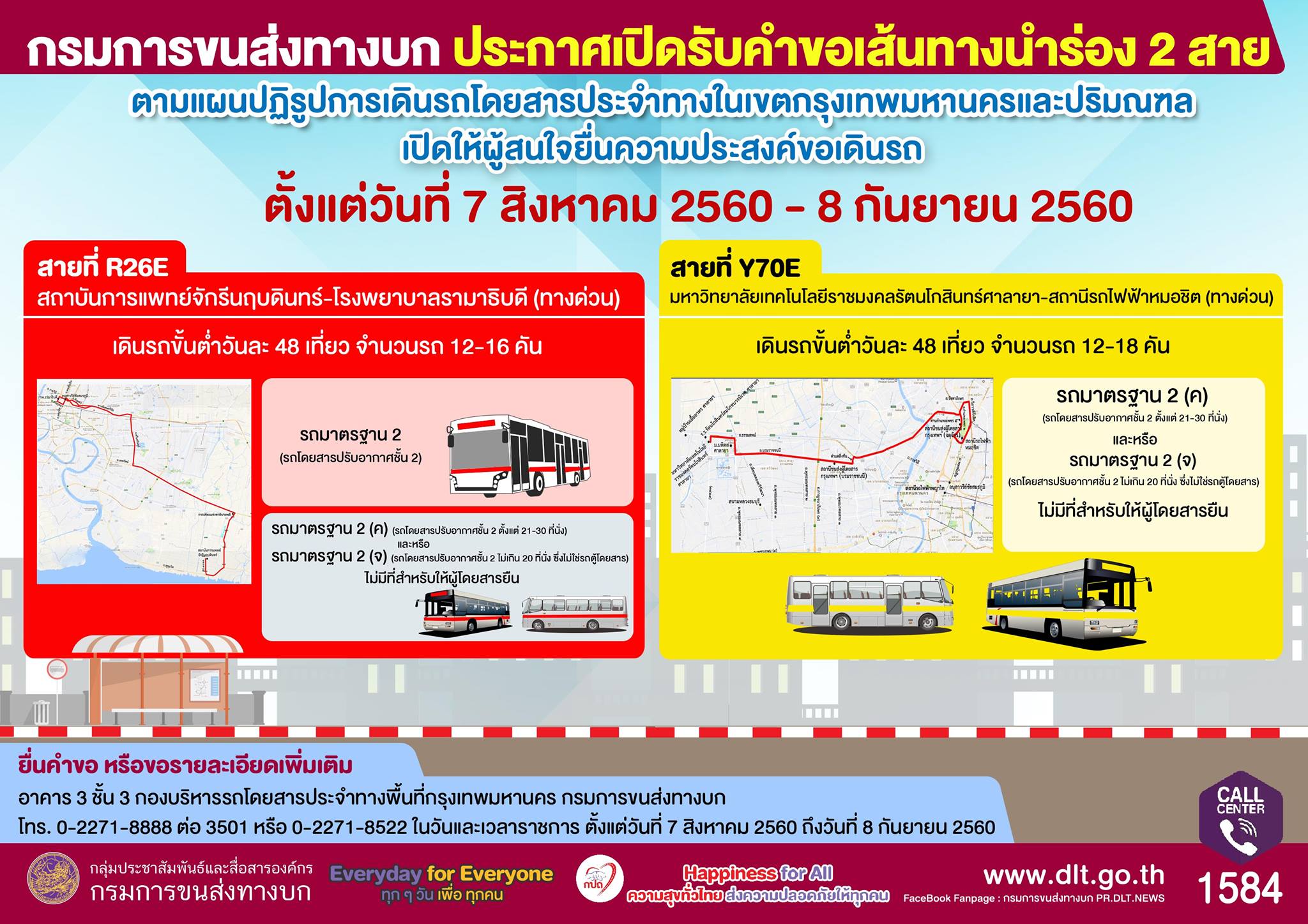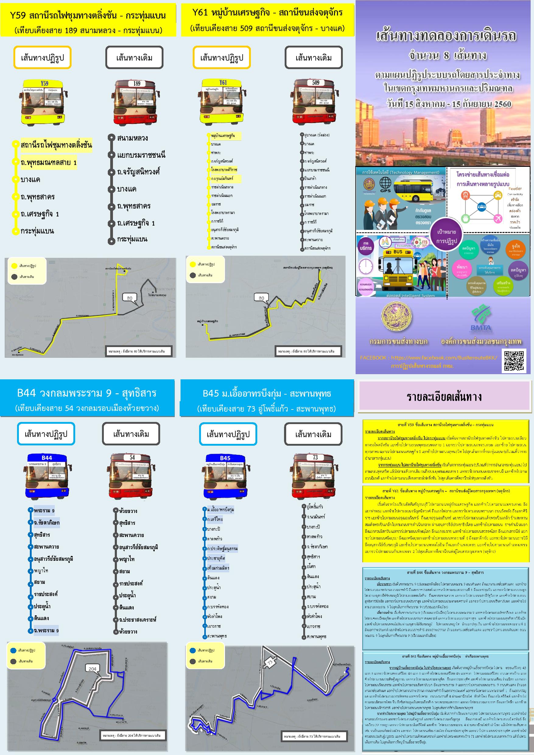 กรมการขนส่งทางบก-ขสมก. ทดลองเดินรถ 8 เส้นทาง ตามแผนปฏิรูประบบรถโดยสารประจำทางในเขตกรุงเทพฯ และปริมณฑล ดีเดย์ 15 สิงหาคม - 15 กันยายน 2560 ก่อนประเมินผลการให้บริการ พร้อมสร้างความรับรู้ความเข้าใจให้กับประชาชน และรับฟังความคิดเห็น ข้อเสนอแนะ นำมาพัฒนายกระดับระบบรถโดยสารประจำทาง