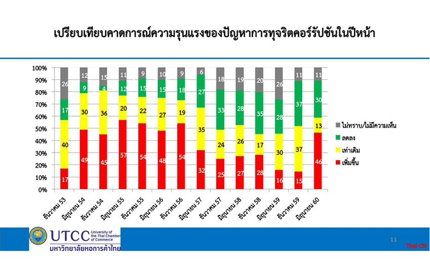 4. ประชาชนเป็นห่วงว่าอาจมีคอร์รัปชันมากขึ้นในหนึ่งปีข้างหน้า ซึ่งคณะผู้สำรวจประเมินว่า อาจเป็นเพราะข่าวและข้อสงสัยเกี่ยวกับความไม่โปร่งใสในการใช้อำนาจและการดำเนินโครงการต่างๆ ที่มีการตั้งคำถามกันมากในขณะนี้ กอปรกับการที่รัฐจะมีการลงทุนในเมกกะโปรเจคอีกเป็นจำนวนมาก