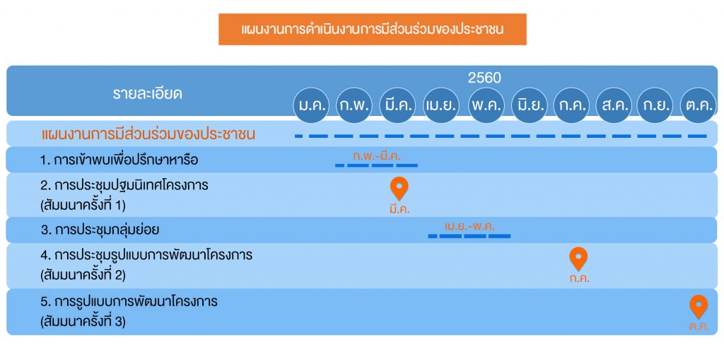 ระบุว่า การดำเนินงานด้านการมีส่วนร่วมของประชาชน มีความจำเป็นอย่างยิ่งที่จะต้องให้กลุ่มผู้มีส่วนได้ ส่วนเสียได้รับรู้ข้อมูลข่าวสารโครงการทุกระยะของการดำเนินงาน และร่วมแสดงความคิดเห็นและข้อเสนอแนะ เพื่อนำมาใช้ประโยชน์ในการพัฒนาโครงการให้มีความปลอดภัยและมีประสิทธิภาพสูงสุด โดยมีขั้นตอนการประชาสัมพันธ์ และแผนงานการดำเนินงานการมีส่วนร่วมของประชาชน ดังนี้
