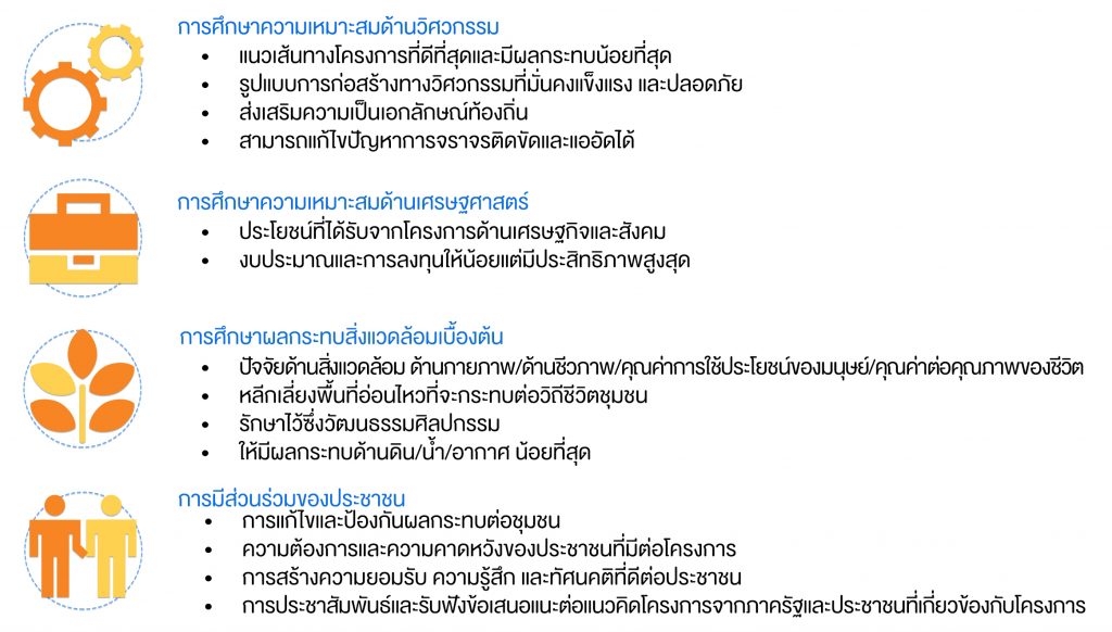 แนวทางที่ใช้ในการศึกษาความเหมาะสมและผลกระทบสิ่งแวดล้อมเบื้องต้น จะใช้แนวทางในส่วนที่เกี่ยวข้องเป็นหลักประกอบด้วยงานหลัก 4 ด้าน ดังนี้
