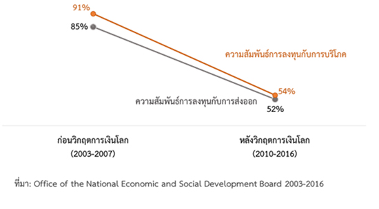 1.การลงทุนต่ำ ไม่ใช่เพราะความต้องการสินค้าสำหรับส่งออกและบริโภคในประเทศลดลงเพียงอย่างเดียว แต่เป็นเพราะ “รูปแบบการค้าและการบริโภคเปลี่ยนไป” ด้วย เห็นได้จากความสัมพันธ์ระหว่างการลงทุนกับการส่งออกและการบริโภคที่ลดลงชัดเจน