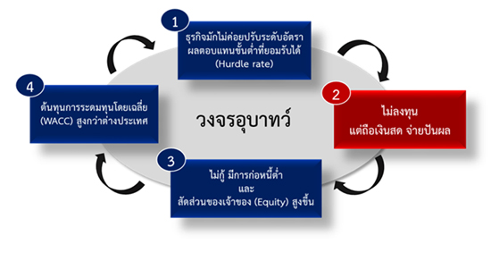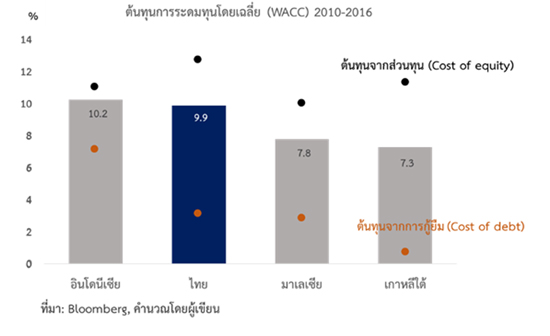 แม้อัตราดอกเบี้ยไทยจะต่ำ แต่เหตุที่ธุรกิจยังไม่ลงทุน เป็นเพราะแม้ธุรกิจจะมีต้นทุนจากการกู้ยืม (Cost of debt) ค่อนข้างต่ำสอดคล้องกับทิศทางอัตราดอกเบี้ยนโยบาย แต่ต้นทุนการระดมทุนโดยเฉลี่ยของธุรกิจ (WACC ) ยังขึ้นอยู่กับต้นทุนจากส่วนทุน (Cost of equity) ด้วย ซึ่งต้นทุนจากส่วนทุนโดยเฉลี่ยของไทยยังสูงกว่าประเทศเพื่อนบ้าน ดังนั้น WACC ของไทยจึงยังสูงกว่าประเทศอื่นอยู่ประมาณ 2% (รูปที่ 2)