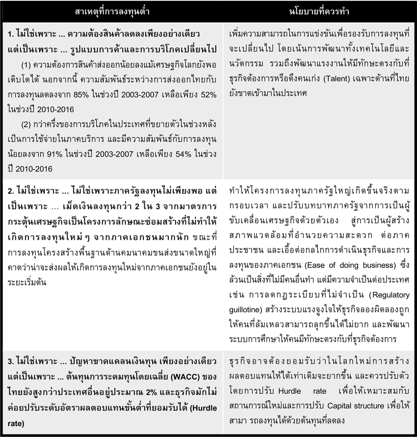 ซึ่งสามารถสรุปได้ว่าสิ่งสำคัญที่ทำให้การลงทุนภาคเอกชนต่ำไม่ได้อยู่ที่ตัวเงิน แต่เป็นเพราะ (1) รูปแบบการค้าและการบริโภคเปลี่ยนไป (2) การลงทุนภาครัฐส่วนใหญ่เป็นลักษณะซ่อมสร้างที่ไม่ช่วยให้เกิดการลงทุนใหม่ๆ จากภาคเอกชนมากนัก และ (3) ต้นทุนการระดมทุนของไทยสูงกว่าประเทศอื่น