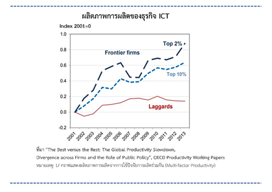เมื่อการลงทุนสามารถใช้เทคโนโลยีได้มากขึ้น ทำให้มีโอกาสสูงที่ผลประโยชน์จากการลงทุนจะกระจุกตัวในรายใหญ่หรือผู้นำตลาด (Winner-take-all) เพราะธุรกิจที่พึ่งพาเทคโนโลยีสูง บริษัทที่เป็นผู้นำจะมีผลิตภาพการผลิตที่ดีกว่าบริษัทขนาดเล็กมากขึ้นเรื่อยๆ เพราะผู้นำตลาดจะมีความสามารถในการประยุกต์ใช้และพัฒนาเทคโนโลยีได้ดีกว่าบริษัทขนาดเล็ก และทำให้ยิ่งสร้างรายได้ทิ้งห่างจากบริษัทขนาดเล็ก ตัวอย่างที่เห็นชัดที่สุด คือ ธุรกิจ ICT ที่ศักยภาพการผลิต (Productivity) ระหว่างกลุ่มผู้นำและกลุ่มรั้งท้าย (Frontier firm and laggards) มีความแตกต่างสูง แถมในกลุ่มผู้นำด้วยกันเอง บริษัท Top 2% (Elite) ก็ยังทำได้ดีกว่าบริษัทที่อยู่ใน Top 10% มาก (รูปที่ 11) ซึ่งจะเห็นได้ว่า ผู้ได้รับประโยชน์มีน้อยรายและสามารถสร้างผลประโยชน์จากการลงทุนและผลิตได้เรื่อยๆ จึงเกิดประเด็นที่ชวนคิดต่อว่า หากหน้าตาโลกใหม่เป็นแบบนี้ จะยิ่งทำให้รายใหม่หรือรายเล็กมีโอกาสเกิดและอยู่รอดได้ยากมากขึ้นหรือไม่ โดยหากดูโครงสร้างธุรกิจของไทย เรามีสัดส่วนธุรกิจขนาดเล็กค่อนข้างสูง มีการจ้างงานมาก