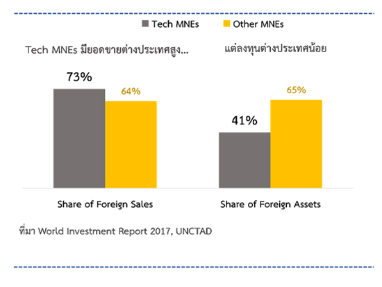 ด้วยเทคโนโลยีที่เปลี่ยนไป อาจทำให้ความต้องการในการลงทุนสินทรัพย์ถาวร (Fixed asset) โดยรวมลดลง เพราะ 1) MNEs ภาคบริการที่มาพร้อมกับ เทคโนโลยีใหม่ๆ อาจมีการลงทุนต่างประเทศน้อยกว่า MNEs ภาคอุตสาหกรรม เนื่องจากสามารถให้บริการในต่างประเทศได้โดยไม่ต้องลงทุนในประเทศปลายทาง เช่น Google มีการสร้างระบบจัดเก็บข้อมูลกลาง (Data center) 15 แห่งเพื่อให้บริการทั่วโลก แต่ในจำนวนนี้มีเพียง 2 แห่งที่อยู่ในเอเชีย ได้แก่ สิงคโปร์และไต้หวัน ส่วนอีก 13 แห่งอยู่ในอเมริกาและยุโรป และ 2) ธุรกิจในประเทศมีความจำเป็นในการลงทุนเองลดลง เนื่องจากธุรกิจไม่ต้องลงทุนสินทรัพย์ถาวรด้วยตนเอง แต่สามารถซื้อบริการจาก Service provider ได้ เป็นการใช้ Resource sharing มากขึ้น เช่น ธุรกิจ A ที่เป็นผู้ประกอบการรายย่อยสามารถเข้าถึงคอมพิวเตอร์ที่มีศักยภาพในการประมวลผลสูง โดยไม่จำเป็นต้องลงทุนเอง เพราะสามารถใช้บริการ Cloud computing ของ Amazon Web services (AWS) โดยที่ธุรกิจ A ไม่ต้องลงทุนสร้างและดูแลระบบเอง ซึ่งรูปแบบที่กล่าวมาข้างต้นเป็นไปในทิศทางเดียวกับการสำรวจของ UNCTAD ที่เปรียบเทียบ Tech MNEs และ MNEs ทั่วไป พบว่าทั้งสองประเภทมีสัดส่วนรายได้จากต่างประเทศใกล้เคียงกัน แต่ Tech MNEs มีการลงทุนในต่างประเทศที่น้อยกว่า (รูปที่ 1) สะท้อนว่าไทยไม่อาจคาดหวังให้เม็ดเงินลงทุนจาก Tech MNEs ได้มากเหมือนกับ MNEs ทั่วไปอย่างในอดีต
