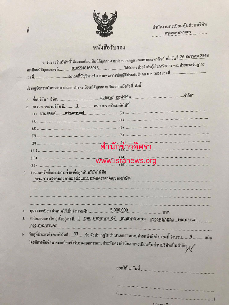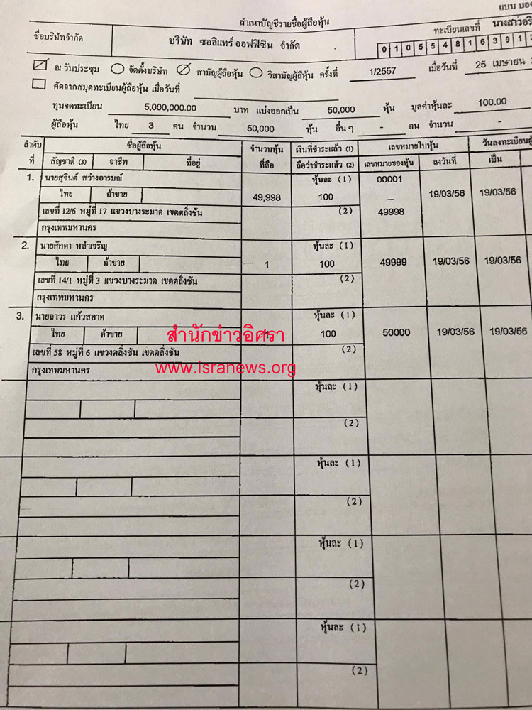 ล่าสุด สำนักข่าวอิศรา ตรวจสอบข้อมูลเอกสารหลักฐานการจดทะเบียนจัดตั้งบริษัท ซอร์ลิแทร์ ออฟฟิซิน จำกัด ที่แจ้งไว้กับกรมพัฒนาธุรกิจการค้า พบว่า ในช่วงจดทะเบียนจัดตั้งเมื่อวันที่ 26 ธ.ค.2548 บริษัทฯ แจ้งทุนจดทะเบียน 2 ล้านบาท ตั้งอยู่เลขที่ 140/3 หมู่ที่ 10 แขวงบางแค เขตบางแค กทม.