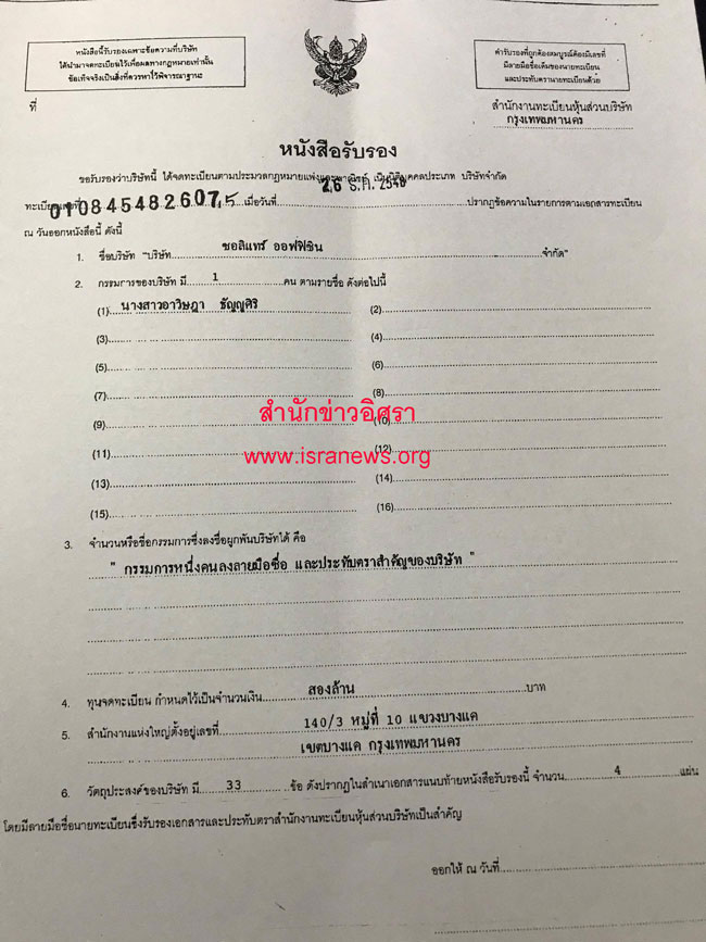 "..สำนักข่าวอิศรา ตรวจสอบข้อมูลเอกสารหลักฐานการจดทะเบียนจัดตั้งบริษัท ซอร์ลิแทร์ ออฟฟิซิน จำกัด ที่แจ้งไว้กับกรมพัฒนาธุรกิจการค้า พบว่า ในช่วงจดทะเบียนจัดตั้งเมื่อวันที่ 26 ธ.ค.2548 บริษัทฯ แจ้งทุนจดทะเบียน 2 ล้านบาท ตั้งอยู่เลขที่ 140/3 หมู่ที่ 10 แขวงบางแค เขตบางแค กทม. ปรากฏชื่อนางสาวอาวิษฎา ธัญญศิริ เป็นกรรมการผู้มีอำนาจ เป็นผู้แจ้งจองชื่อตั้งบริษัทฯ และถือหุ้นใหญ่สุด..22 มี.ค.2556 นางสาวอาวิษฎา ธัญญศิริ แจ้งลาออกจากกรรมการ ปรากฏชื่อนายสุจินต์ สว่างอารมณ์ เข้ามาเป็นกรรมการ และถือหุ้นใหญ่แทน ขณะที่จากการตรวจสอบข้อมูลงบการเงิน ปี 2556 และหมายเหตุประกอบงบการเงินของบริษัทฯ พบว่า มีการแจ้งตัวเลขรายได้ไว้ที่ 1,932,631,606.58 บาท แต่ไม่ได้ระบุที่มาของรายได้ว่ามาจากการทำธุรกิจอะไรกันแน่..."