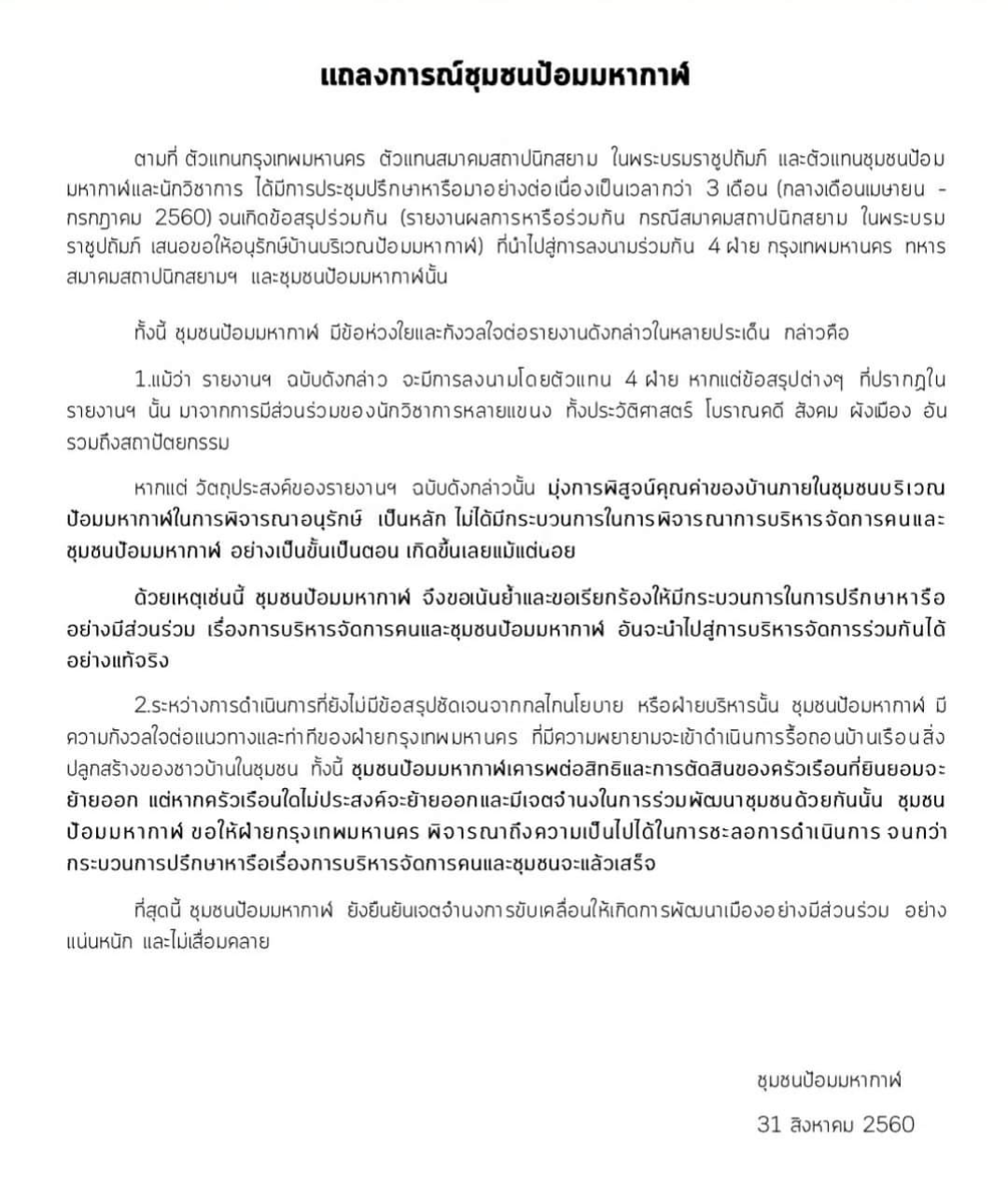 พร้อมกันนี้ยังได้แสดงความกังวลใจต่อแนวทางและท่าทีของฝ่ายกรุงเทพมหานคร ที่เข้ารื้อถอนบ้านเรือนสิ่งปลูกสร้างของชาวบ้านในชุมชนด้วย