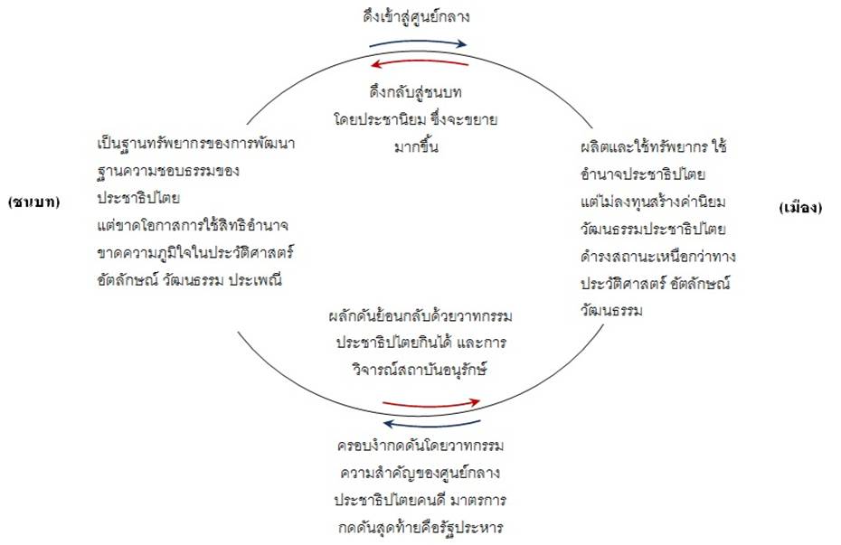 แต่นี่เป็นการมองเชิงปรากฏการณ์ ถ้ามองเชิงโครงสร้างเราจะมองเห็นวงจรของการเอารัดเอาเปรียบทางเศรษฐกิจการเมืองซ้อนทับอยู่ คือ ชนบทเป็นแหล่งที่มาของทรัพยากร แรงงานที่จำเป็นต่อการพัฒนาเศรษฐกิจ และเป็นแหล่งที่มาที่ชอบธรรมให้กับประชาธิปไตย (ซึ่งก็คือการเลือกตั้ง) ส่วนเมืองเป็นแหล่งผลิตใช้ทรัพยากร และเป็นผู้ใช้อำนาจประชาธิปไตย และเพื่อให้วงจรนี้ดำรงต่อไปได้ก็มีการครอบงำชาวบ้าน โดยวาทกรรมความสำคัญของศูนย์กลาง ของประชาธิปไตยคนดี และมาตรการสุดท้ายคือรัฐประหาร