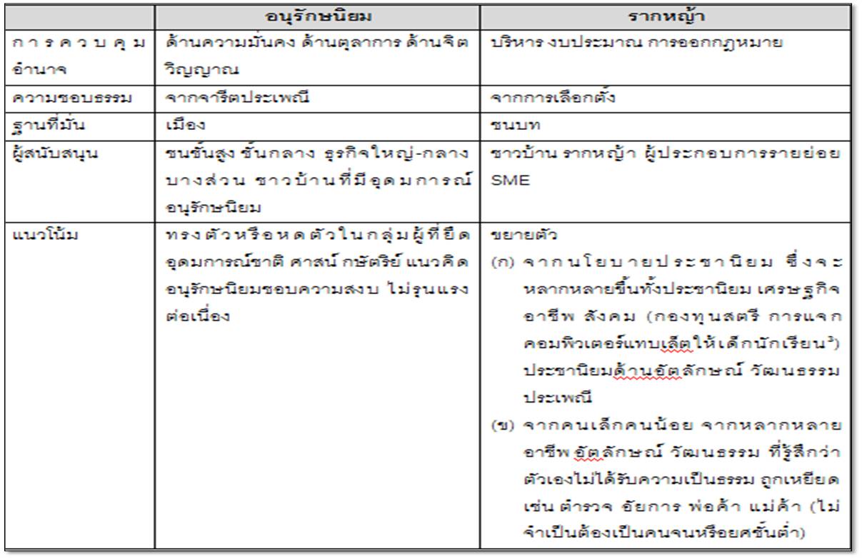 จะเห็นได้ว่าฝ่ายเสื้อแดง-รากหญ้าอยู่ในสถานะได้เปรียบ ฝ่ายอนุรักษ์เสียเปรียบ เพราะ (ก) แนวทางและวาทกรรมในการต่อสู้ของเสื้อแดงจูงใจคนเล็กคนน้อย (แต่เป็นคนส่วนใหญ่ได้) ส่วนของความคิดอนุรักษ์จำกัดอยู่ในเรื่องชาติและพระมหากษัตริย์ (ข) เสื้อแดงมีความชอบธรรมในเรื่องประชาธิปไตยจากการเลือกตั้ง ซึ่งเป็นความชอบธรรมสากลของโลกปัจจุบัน ส่วนความชอบธรรมของฝ่ายอนุรักษ์เป็นเชิงประวัติศาสตร์ประเพณีซึ่งเกาแก่และสึกกร่อนได้ (ค) วิสัยทัศน์ของพลังอนุรักษ์ตีบตันจึงเป็นฝ่ายตั้งรับ ในขณะที่ฝ่ายรากหญ้าเส้นทางเปิดกว้างเพราะสามารถคิดสิ่งใหม่ๆ มาให้กับชาวบ้านได้ โดยมีงบประมาณ ทรัพยากรรองรับ