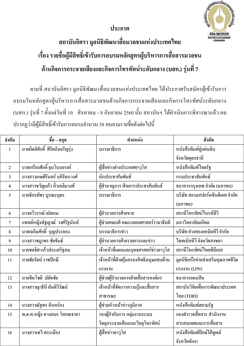 ตามที่ สถาบันอิศรา มูลนิธิพัฒนาสื่อมวลชนแห่งประเทศไทย ได้ประกาศรับสมัครผู้เข้ารับการอบรมในหลักสูตรผู้บริหารการสื่อสารมวลชนด้านกิจการกระจายเสียงและกิจการโทรทัศน์ระดับกลาง (บสก.) รุ่นที่ 7 ตั้งแต่วันที่ 10 สิงหาคม - 8 กันยายน 2560 นั้น สถาบันฯ ได้ดำเนินการพิจารณาแล้ว ผลปรากฏว่ามีผู้มีสิทธิ์เข้ารับการอบรมจำนวน 58 คนตามรายชื่อดังต่อไปนี้
