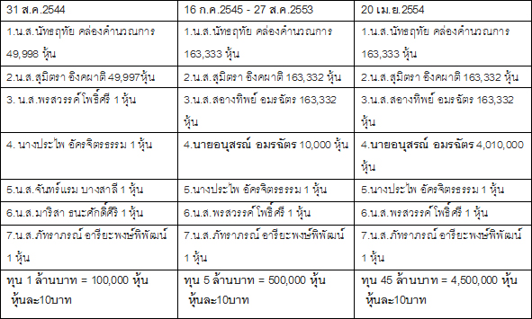 ณ วันที่ 26 ส.ค. 2549- 26 ส.ค. 2550 ในช่วงมีการให้กู้ยืมมีทุนจดทะเบียน 5 ล้านบาท แบ่งเป็น 500,000 หุ้น หุ้นละ10 บาท น.ส.นัทธฤทัย คล่องคำนวณการ (เครือญาติ น.ส.ยิ่งลักษณ์) ถือหุ้นใหญ่ 163,333 หุ้น น.ส.สุมิตรา อิงคผาติ (ผู้ลงนามออกตั๋วสัญญาใช้เงิน) 163,332 หุ้น และ น.ส.สอางทิพย์ อมรฉัตร 163,332 หุ้น (ดูตาราง)