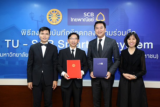 ธนาคารไทยพาณิชย์ ร่วมกับ มหาวิทยาลัยธรรมศาสตร์ โดยคณะพาณิชยศาสตร์และการบัญชี ลงนามบันทึกข้อตกลงความร่วมมือ TU-SCB Smart Ecosystem ร่วมพัฒนาระบบการให้บริการด้วยนวัตกรรม เดินหน้าสร้างรากฐานระบบนิเวศดิจิทัล (Digital Ecosystem) เพื่อพัฒนาและส่งเสริมการเรียนการสอน ยกระดับการเรียนรู้ การให้บริการแก่นักศึกษา บุคลากร ผู้ประกอบการร้านค้า ตลอดจนชุมชนโดยรอบมหาวิทยาลัย ปลูกฝังให้เทคโนโลยีดิจิทัลเป็นส่วนหนึ่งในชีวิตประจำวันของทุกคนในชุมชนธรรมศาสตร์ ทั้งท่าพระจันทร์ และรังสิต และพร้อมมุ่งสู่มหาวิทยาลัยไร้เงินสด (Cashless University) เพื่อเป็นต้นแบบให้กับสังคม โดยมี ศาสตราจารย์ ดร.สมคิด เลิศไพฑูรย์ อธิการบดี (ที่ 2 จากซ้าย) รองศาสตราจารย์ ดร.พิภพ อุดร คณบดีคณะพาณิชยศาสตร์และการบัญชี (ซ้าย) มหาวิทยาลัยธรรมศาสตร์ นายอาทิตย์ นันทวิทยา กรรมการผู้จัดการใหญ่และประธานเจ้าหน้าที่บริหาร (ที่ 2 จากขวา) นางกิตติยา โตธนะเกษม รองผู้จัดการใหญ่อาวุโส Chief Financial Officer (ขวา) ธนาคารไทยพาณิชย์ ร่วมในพิธี โดยงานจัดขึ้น ณ คณะพาณิชยศาสตร์และการบัญชี มหาวิทยาลัยธรรมศาสตร์ ท่าพระจันทร์