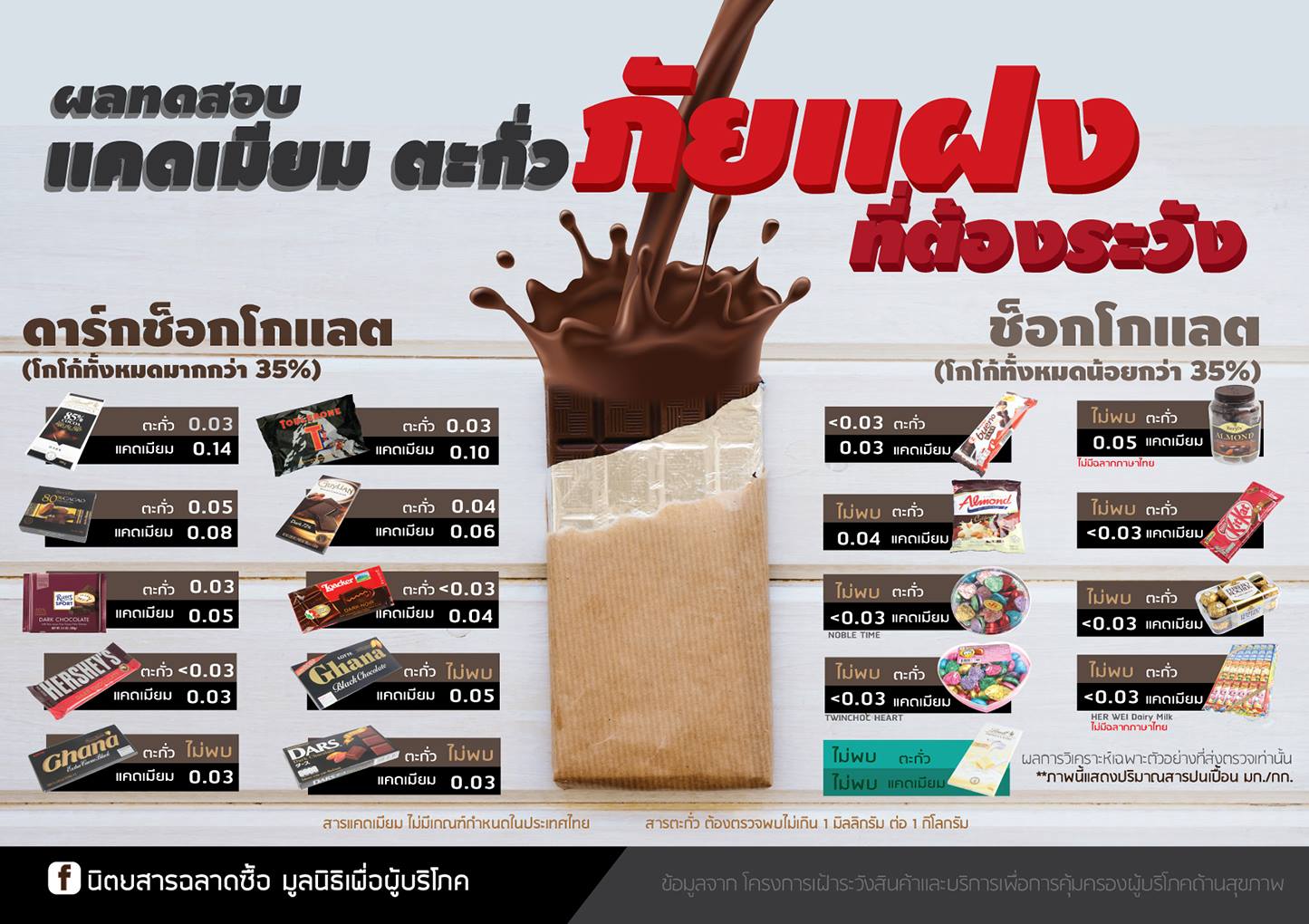 สำหรับการสุ่มตรวจช็อกโกแลต 19 ยี่ห้อ พบ 1.กลุ่มที่ปนเปื้อนตะกั่วและแคดเมียม 8 ตัวอย่าง 2.กลุ่มที่ปนเปื้อนแคดเมียมอย่างเดียว 10 ตัวอย่าง โดยไม่มี 'ตะกั่ว' และมีอยู่ช็อกโกแลตยี่ห้อเดียวที่ไม่พบการปนเปื้อนของตะกั่วและแคดเมียมเลย คือ ยี่ห้อ lindt swiss classic white chocolate