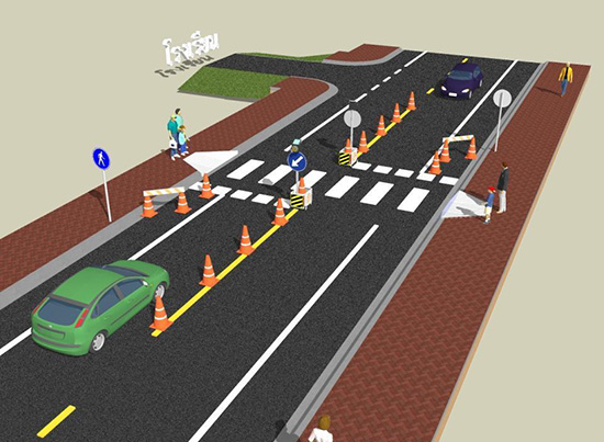 - วางกรวยสะท้อนแสงในตำแหน่ง¬ติดกับทางม้าลาย เพื่อป้องกันไม่ให้มีรถมาจอด รวมทั้งวางกรวยที่เส้นแบ่งถนนเพื่อเตือนให้รถที่วิ่งผ่านไปมาเห็นได้ชัดและชะลอความเร็ว
