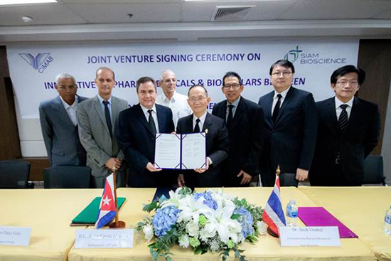 นายเอกตอร์ กอนเด อัลเมย์ เอกอัครราชทูตสาธารณรัฐคิวบาประจำประเทศไทย และดร. เสนาะ อูนากูล ประธานกรรมการ บริษัท สยามไบโอไซเอนซ์ จำกัด ร่วมกันเป็นประธานในพิธีลงนามในสัญญาความร่วมมือจัดตั้ง บริษัท เอบินิส จำกัด บริษัทร่วมทุนด้านนวัตกรรมการวิจัยพัฒนา และผลิตยาไบโอฟาร์มา เพื่อการรักษาโรคมะเร็งและ โรคภูมิต้านตนเอง ที่มีความปลอดภัยและมีประสิทธิภาพสูงในการรักษาโรค พร้อมส่งออกทั่วโลก ทั้งนี้ โรงงานผลิตยา ดังกล่าว จะสร้างเสร็จภายในสิ้นปี 2561 ซึ่งเป็นปีแห่งการฉลองความสัมพันธ์ทางการฑูตระหว่างราชอาณาจักรไทยและสาธารณรัฐคิวบา ครบรอบ 60 ปี