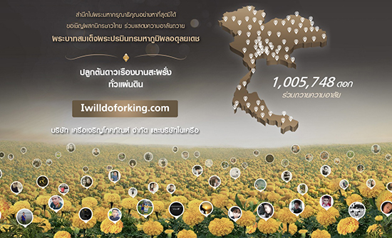 ด้วยสำนึกในพระมหากรุณาธิคุณอย่างหาที่สุดมิได้ เครือเจริญโภคภัณฑ์และทรู คอร์ปอเรชั่น โดย นายศุภชัย เจียรวนนท์ ประธานคณะผู้บริหาร เครือเจริญโภคภัณฑ์ และประธานคณะกรรมการบริหาร บมจ.ทรู คอร์ปอเรชั่น นำคณะผู้บริหารและพนักงาน ร่วมปลูกต้นดาวเรืองให้เหลืองอร่ามบานสะพรั่งทั่วแผ่นดิน ในช่วงพระราชพิธีถวายพระเพลิงพระบรมศพ พระบาทสมเด็จพระปรมินทรมหาภูมิพลอดุลยเดช บรมนาถบพิตร ณ อาคารสำนักงานเครือทั้งในและต่างประเทศทั่วโลก พร้อมเชิญชวนพสกนิกรไทยร่วมถวายความอาลัยทางเว็บไซต์ www.iwilldoforking.com แล้วแชร์ผ่านเฟซบุ๊ค ซึ่งทุกการแชร์ ดอกดาวเรืองจะบานสะพรั่งทั่วหน้าเว็บไซต์ตลอดเดือนตุลาคมนี้ รวมถึงเปิดให้รับต้นกล้าดาวเรืองที่กลุ่มทรู จัดเตรียมไว้ จำนวน 9,999 ต้น โดยไม่เสียค่าใช้จ่าย ณ ทรูสเฟียร์ และทรูช้อป