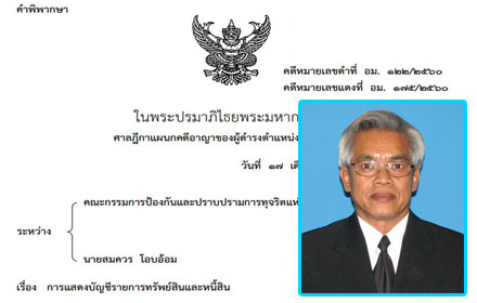 ผู้สื่อข่าวสำนักข่าวอิศรา www.isranews.org รายงานว่า เมื่อวันที่ 19 ต.ค. 2560 ราชกิจจานุเบกษาเผยแพร่คำพิพากษาศาลฎีกาแผนกคดีอาญาของผู้ดำรงตำแหน่งทางการเมือง คดีที่คณะกรรมการป้องกันและปราบปรามการทุจริตแห่งชาติ (ป.ป.ช.) เป็นผู้ร้อง นายสมควร โอบอ้อม อดีต ส.ส.นครสวรรค์ พรรคประชาธิปัตย์ เป็นผู้คัดค้าน