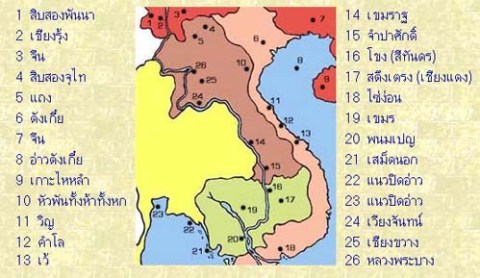 1 บริเวณที่ตั้งเมืองไท-ไตต่างๆ ในแคว้นสิบสองจุไท (เวียดนามตอนเหนือ)