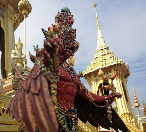 5. ภูมิทัศน์ด้านหน้าพระเมรุมาศ สะท้อนให้เห็นถึงพระราชกรณียกิจของในหลวงรัชกาลที่ 9 อันเนื่องมาจาก โครงการพระราชดำริ เช่น พันธุ์ข้าวพระราชทาน หญ้าแฝก ต้นยางนา มะม่วงมหาชนก กังหันชัยพัฒนา ฝายน้ำล้น ส่วนนาข้าวจะมีขอบคันนาออกแบบเชิงเป็นเลขเก้าไทย
