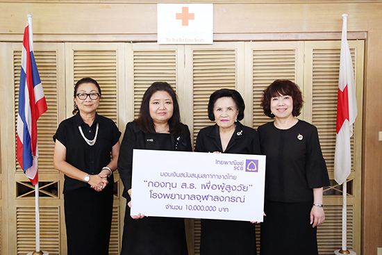 ธนาคารไทยพาณิชย์ส่งเสริมการพัฒนาคุณภาพชีวิตสำหรับผู้สูงอายุ เพื่อให้เข้าถึงการดูแลสุขภาพที่ดีด้วยการจัดสร้าง “อาคาร ส.ธ.” ศูนย์บริการทางการแพทย์และสาธารณสุขด้านผู้สูงอายุแบบบูรณาการที่ครบวงจร เฉลิมพระเกียรติ 60 พรรษา สมเด็จพระเทพรัตนราชสุดาฯ สยามบรมราชกุมารี อุปนายิกาผู้อำนวยการ สภากาชาดไทย ณ โรงพยาบาลจุฬาลงกรณ์ สภากาชาดไทย โดยมอบเงิน 10 ล้านบาท ต่อเนื่องเป็นเวลา 3 ปี โดยมีนางสาวอารยา ภู่พานิช (กลางซ้าย) รองผู้จัดการใหญ่ ผู้บริหารสูงสุดกิจกรรมเพื่อสังคม ภาพลักษณ์และสื่อสารองค์กร ธนาคารไทยพาณิชย์ เป็นผู้แทนมอบให้แก่ ม.ร.ว.ปรียางค์ศรี วัฒนคุณ (กลางขวา) ผู้ช่วยเลขาธิการฯ ฝ่ายการจัดหารายได้ และผู้อำนวยการสำนักงานจัดหารายได้ สภากาชาดไทย ณ ตึกอำนวยนรธรรม สภากาชาดไทย