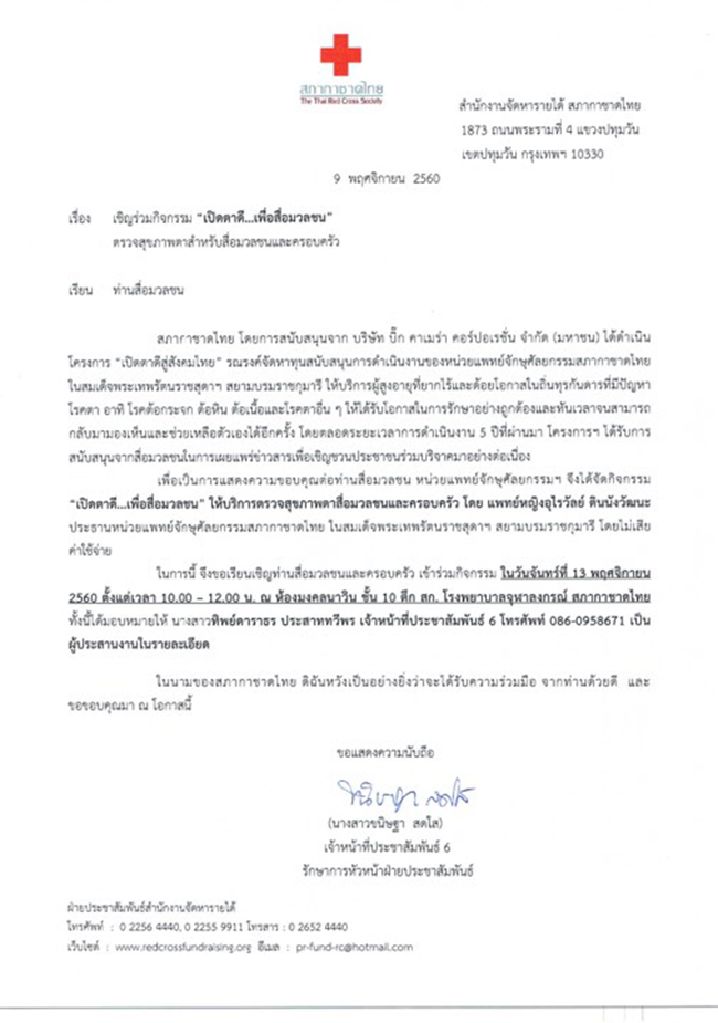 สภากาชาดไทยตรวจสุขภาพสื่อฟรี ในโครงการ “เปิดตาดี…เพื่อสื่อมวลชน” 13 พ.ย. 60 นี้