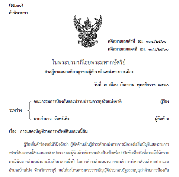 1. นายอำนาจ จันทร์เพ็ง นายกองค์การบริหารส่วนตำบล (อบต.) ปากแรต อ.บ้านโป่ง จ.ราชบุรี ผู้คัดค้านมีความผิดตามพระราชบัญญัติประกอบรัฐธรรมนูญ ว่าด้วยการป้องกันและปราบปรามการทุจริต พ.ศ. 2542 มาตรา 119 ฐานเป็นเจ้าหน้าที่ของรัฐ จงใจยื่นบัญชีแสดงรายการทรัพย์สินและหนี้สินและเอกสารประกอบต่อผู้ร้องด้วยข้อความอันเป็นเท็จ หรือปกปิดข้อเท็จจริงที่ควรแจ้งให้ทราบ โดยไม่แสดงรายการทรัพย์สิน คือ เงินฝากธนาคาร 1 บัญชี ยานพาหนะ 2 คัน และไม่แสดงรายการหนี้สิน คือ หนี้ตามคำพิพากษาของศาลจังหวัดราชบุรี ในคดีหมายเลขดำที่ ผบ.616/2552 คดีหมายเลขแดงที่ 101/2553 จำนวน 348,914 บาท กรณีพ้นจากตำแหน่งมาแล้วเป็นเวลาหนึ่งปี ในการดำรงตำแหน่ง นายก อบต.ปากแรต จำคุก 2 เดือน และปรับ 8,000 บาท ผู้คัดค้านให้การรับสารภาพ เป็นประโยชน์แก่การพิจารณา มีเหตุบรรเทาโทษ ลดโทษให้กึ่งหนึ่ง คงจำคุก 1 เดือน และปรับ 4,000 บาท ไม่ปรากฏว่า ผู้คัดค้านได้รับโทษจำคุกมาก่อน โทษจำคุกจึงให้รอการลงโทษไว้มีกำหนด 1 ปี (คดีหมายเลขแดงที่ อม. 188/2560-7 ก.ย. 2560)