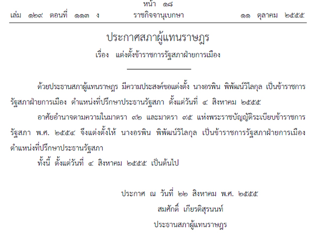 นางอรพินท์ (เจ๊หงส์) ได้รับแต่งตั้งเป็นข้าราชการรัฐสภาฝ่ายการเมือง ตำแหน่งที่ปรึกษาประธานรัฐสภา ตั้งแต่วันที่ 4 ส.ค.2555 ในยุคนายสมศักดิ์ เกียรสุรนนท์ เป็นประธานสภาผู้แทนราษฎร http://www.ratchakitcha.soc.go.th/DATA/PDF/2555/D/113/18.PDF และลาออกจากตำแหน่งเมื่อวันที่ 2 ส.ค.2556 http://www.ratchakitcha.soc.go.th/DATA/PDF/2556/D/109/3.PDF
