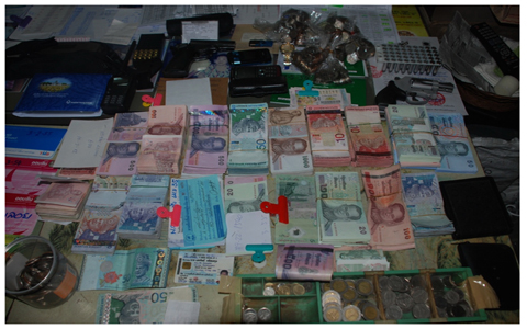 บรรยายภาพ : เงินสดทั้งสกุลต่างประเทศและเงินบาทไทยที่ยึดได้จากร้านรับแลกเงินใน อ.สุไหงโก-ลก