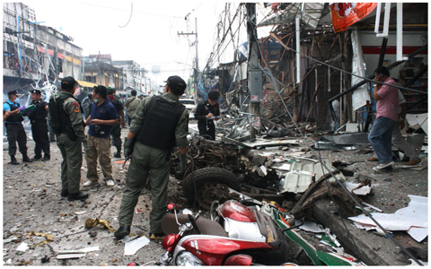 เหตุรุนแรงที่ชายแดนใต้เมื่อวันสุดท้ายของเดือน มี.ค.2555 แม้กรณีระเบิดในลานจอดรถของอาคารลีการ์เด้นส์พลาซ่ากลางเมืองหาดใหญ่จะยังไม่มีบทสรุปอย่างเป็นทางการร้อยเปอร์เซ็นต์ว่าเป็นการก่อวินาศกรรม แต่กรณีคาร์บอมบ์และมอเตอร์ไซค์บอมบ์กลางเมืองยะลาไม่อาจสรุปเป็นเรื่องอื่นได้