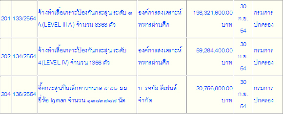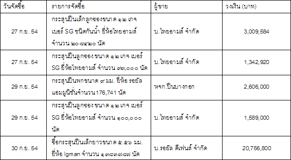 1.กระสุนปืนเล็กลูกซองขนาด 12 เกจ เบอร์ SG ชนิดกันน้ำ ยี่ห้อไทยอามส์ จากบริษัท ไทยอามส์ จำกัด จำนวน 208,420 นัด วงเงิน 3,009,584 บาท (27 ก.ย. 54)