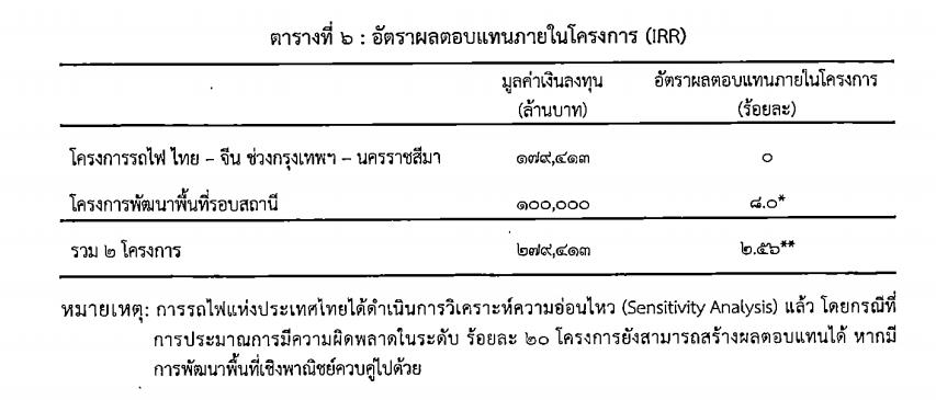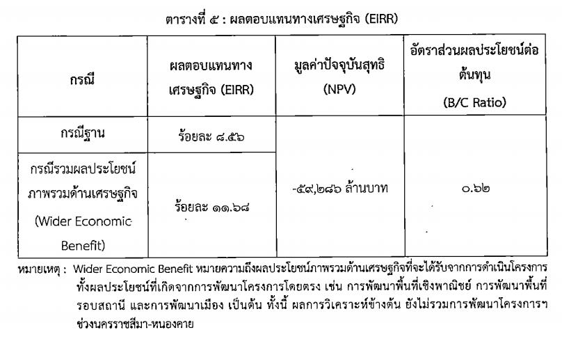 สำนักข่าวอิศรา www.isranews.org ได้ค้นมติครม.เกี่ยวกับโครงการรถไฟความเร็วสูงเส้นกรุงเทพ-นครราชสีมา พบว่า ในช่วงที่เปิดให้บริการหรือตั้งแต่ปี 2564-2594 โครงการนี้จะสร้างผลตอบแทนทางเศรษฐกิจคิดเป็น 11.68% ตั้งแต่การประหยัดค่าใช้จ่ายและลดเวลาการเดินทาง ลดความสูญเสียเนื่องจากอุบัติเหตุ รวมทั้งจะทำให้ไทยเป็นศูนย์กลางโลจีสติกส์ในภูมิภาค กระจายการพัฒนาทางเศรษฐกิจและสังคมจากส่วนกลางไปยังภูมิภาค และสร้างผลตอบแทนเชิงกว้างที่มีผลต่อเศรษฐกิจในพื้นที่ 4 จังหวัด คือ ปทุมธานี อยุธยา สระบุรี และนครราชสีมา เป็นต้น ซึ่งถือว่าคุ้ม แม้ว่าผลตอบแทนทางการเงินของโครงการจะไม่คุ้มค่าก็ตาม
