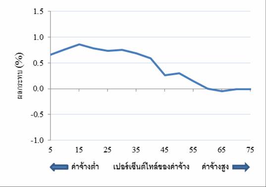 จากการศึกษาด้วยแบบจำลองทางเศรษฐมิติโดยใช้ข้อมูลค่าจ้างในอดีต พบว่าการปรับขึ้นค่าจ้างขั้นต่ำจะช่วยลดความเหลื่อมล้ำของรายได้แรงงานได้มากพอสมควร รูปที่ 2 แสดงประมาณการผลกระทบของการเพิ่มอัตราค่าจ้างขั้นต่ำต่อค่าจ้างแรงงานนอกภาคการเกษตรที่เปอร์เซ็นต์ไทล์ต่างๆของค่าจ้าง โดยพบผลกระทบสูงที่สุดที่เปอร์เซ็นต์ไทล์ที่ 15 กล่าวคือ การขึ้นอัตราค่าจ้างขั้นต่ำ 1% จะทำให้ค่าจ้างของแรงงานกลุ่มนี้เพิ่มขึ้น 0.87% และยังพบอีกว่าผลกระทบในทางบวกต่อค่าจ้างจะมีขึ้นไปถึงประมาณเปอร์เซ็นต์ไทล์ที่ 60-65 (ซึ่งได้รับค่าจ้างประมาณ 407 บาทต่อวันก่อนการปรับค่าจ้างขั้นต่ำ) แต่ขนาดของผลกระทบต่อกลุ่มที่ได้รับค่าจ้างในระดับสูงขึ้นไปจะมีลดหลั่นลงไปตามที่แสดงในรูปที่ 2