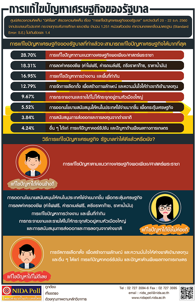 ศูนย์สำรวจความคิดเห็น “นิด้าโพล” สถาบันบัณฑิตพัฒนบริหารศาสตร์ (นิด้า) เปิดเผยผลสำรวจความคิดเห็นของประชาชน เรื่อง “การแก้ไขปัญหาเศรษฐกิจของรัฐบาล” ทำการสำรวจระหว่างวันที่ 20 – 22 ธ.ค. 2560 โดยสอบถามความคิดเห็นจากประชาชนทั่วประเทศ กระจายทุกภูมิภาค ระดับการศึกษา และอาชีพ รวมทั้งสิ้น จำนวน 1,251 หน่วยตัวอย่าง