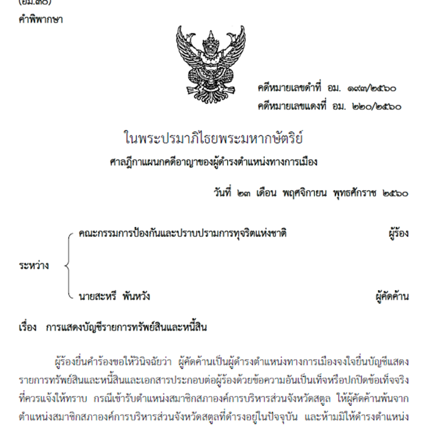 นายสะหรี พันหวัง สมาชิกสภาองค์การบริหารส่วนจังหวัดสตูล (ส.อบจ.สตูล) จงใจยื่นบัญชีแสดงรายการทรัพย์สินและหนี้สิน และเอกสารประกอบต่อผู้ร้องด้วยข้อความอันเป็นเท็จหรือปกปิดข้อเท็จจริงที่แจ้งให้ทราบ กรณีเข้ารับตำแหน่ง ส.อบจ.สตูล ตามพระราชบัญญัติประกอบรัฐธรรมนูญว่าด้วย การป้องกันและปราบปรามการทุจริต พ.ศ. 2542 มาตรา 32 และมาตรา 33 ให้ผู้คัดค้านพ้นจากตำแหน่ง ส.อบจ.สตูลที่ดำรงอยู่นับแต่วันที่ 23 พ.ย.2560 อันเป็นวันที่ศาลฎีกาฯ วินิจฉัย และห้ามมิให้ผู้คัดค้านดำรงตำแหน่งทางการเมืองหรือดำรงตำแหน่งใดในพรรคการเมืองเป็นเวลาห้าปีนับแต่วันที่ 23 พ.ย.2560 ซึ่งเป็นวันที่ศาลฎีกาฯ วินิจฉัย กับมีความผิดตามพระราชบัญญัติประกอบรัฐธรรมนูญว่าด้วยการป้องกันและปราบปรามการทุจริต พ.ศ.2542 มาตรา 119 จำคุก 2 เดือน และปรับ 8,000 บาท ผู้คัดค้านให้การรับสารภาพ เป็นประโยชน์แก่การพิจารณา มีเหตุบรรเทาโทษ ลดโทษให้กึ่งหนึ่ง คงจำคุก 1 เดือน และปรับ 4,000 บาท ไม่ปรากฏว่าผู้คัดค้านเคยได้รับโทษจำคุกมาก่อน โทษจำคุกจึงให้รอการลงโทษไว้มีกำหนด 1 ปี
