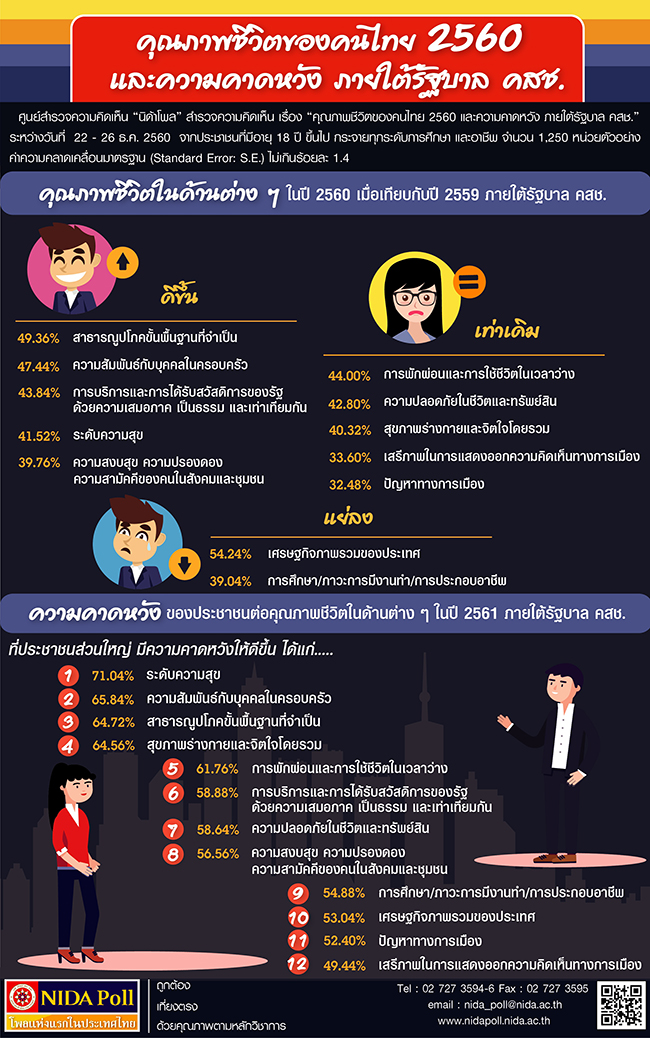 ศูนย์สำรวจความคิดเห็น “นิด้าโพล” สถาบันบัณฑิตพัฒนบริหารศาสตร์ (นิด้า) เปิดเผยผลสำรวจความคิดเห็นของประชาชน เรื่อง “คุณภาพชีวิตของคนไทย 2560 และความคาดหวัง ภายใต้รัฐบาล คสช.” ทำการสำรวจระหว่างวันที่ 22 – 26 ธ.ค. 2560 โดยสอบถามความคิดเห็นจากประชาชนที่มีอายุ 18 ปี ขึ้นไปกระจายทุกระดับการศึกษาและอาชีพ รวมทั้งสิ้น จำนวน 1,250 หน่วยตัวอย่าง เกี่ยวกับคุณภาพชีวิตของคนไทย ปี 2560 ความคาดหวัง ภายใต้รัฐบาล คสช. ในด้านต่าง ๆ