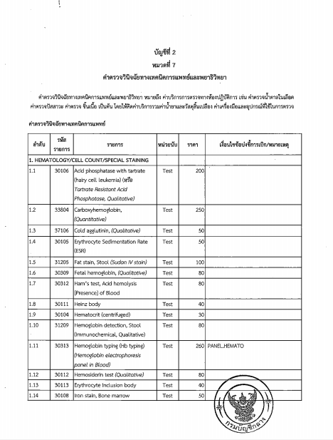 -หมวดที่ 7 ค่าตรวจวินิจฉัยทางเทคนิคการแพทย์และพยาธิวิทยา เฉพาะรายการค่าตรวจวินิจฉัยทางเทคนิคการแพทย์ จำนวนรวมทั้งสิ้น 618 รายการ โดยเป็นรายการเพิ่มใหม่ 161 รายการ และยกเลิกรายการเดิม 144 รายการ