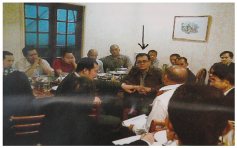 บรรยายภาพ : พ.ต.อ.ทวี สอดส่อง เลขาธิการ ศอ.บต. ขณะสนทนากับ "ชมรมต้มยำกุ้ง" ซึ่งหมายถึงร้านอาหารไทยในมาเลเซีย แต่กลับมีสื่อบางแขนงและฝ่ายการเมืองนำมาตีข่าวว่าเป็นการไปเจรจากับแกนนำขบวนการพูโล โดยคนที่ถูกทำลูกศรชี้ ถูกระบุว่าคือ นายซำซูดิง คาน แกนนำพูโล ทั้งที่จริงๆ คือ นายวันซำซูดิง ดินวันฮูเซ็น ประธานชมรมต้มยำกุ้ง ซึ่งล่าสุดเจ้าตัวออกมาโวยว่าได้รับความเสียหาย และถูกสันติบาลมาเลย์จับตา