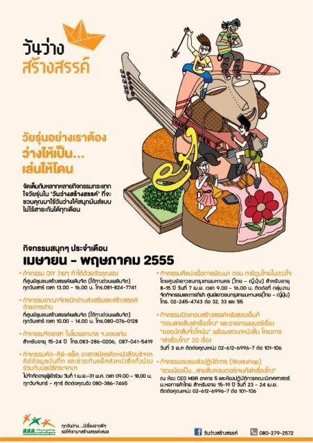 “โครงการวันว่างสร้างสรรค์” ด้วยความร่วมมือของ สสส.และองค์กรภาคีเครือข่าย ต่อยอดมาจากโครงการปิดเทอมสร้างสรรค์ ที่เยาวชนให้การตอบรับล้นหลาม เพราะสร้างกิจกรรมทางเลือกที่เป็นประโยชน์