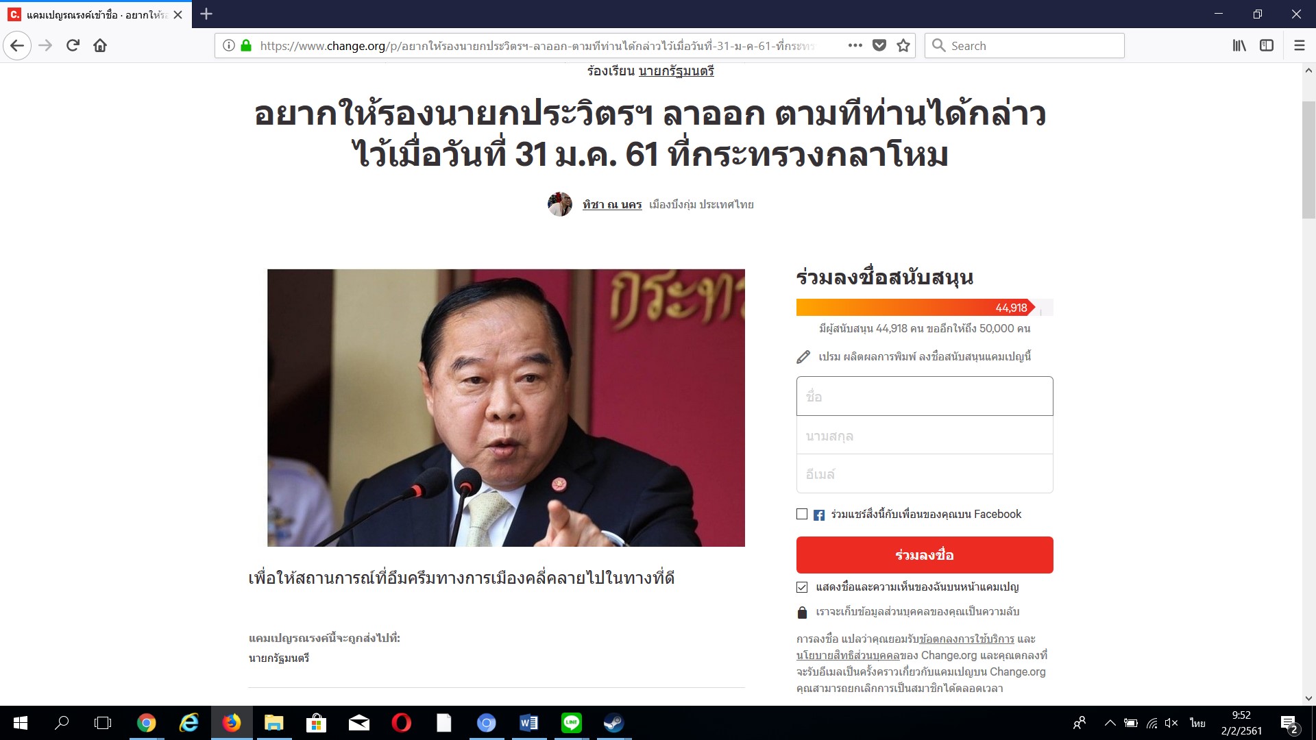 เริ่มกันที่ โพลจากเว็บไซต์ www.Change.org ที่มีการเปิดโพลล์โดย นางทิชา ณ นคร อดีตสมาชิกสภาปฏิรูปแห่งชาติ (สปช.) เมื่อวันที่ 1 ก.พ.ในหัวข้อชื่อว่า “อยากให้รองนายกประวิตรฯ ลาออก ตามที่ท่านได้กล่าวไว้เมื่อวันที่ 31 ม.ค. 61 ที่กระทรวงกลาโหม”