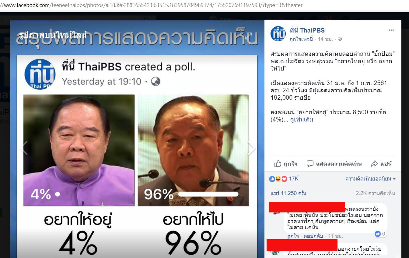 "..สื่อกระแสหลักอย่าง สำนักข่าว TPBS ก็มีการทำโพลออกมาเช่นกัน ผ่านทางเพจเฟซบุ๊ก ที่นี่ TPBS ในชื่อโพลว่า "บิ๊กป้อม" พล.อ.ประวิตร วงษ์สุวรรณ "อยากให้อยู่ หรือ อยากให้ไป" โดยเริ่มทำโพลตั้งแต่ 31 ม.ค. จนถึง วันที่ 1 ก.พ. สรุปรายละเอียดการตอบคำถามโพลว่า มีผู้ลงคะแนน "อยากให้อยู่" ประมาณ 8,500 รายชื่อ (4%) และมีผู้ลงคะแนน "อยากให้ไป" ประมาณ 184,000 รายชื่อ..."
