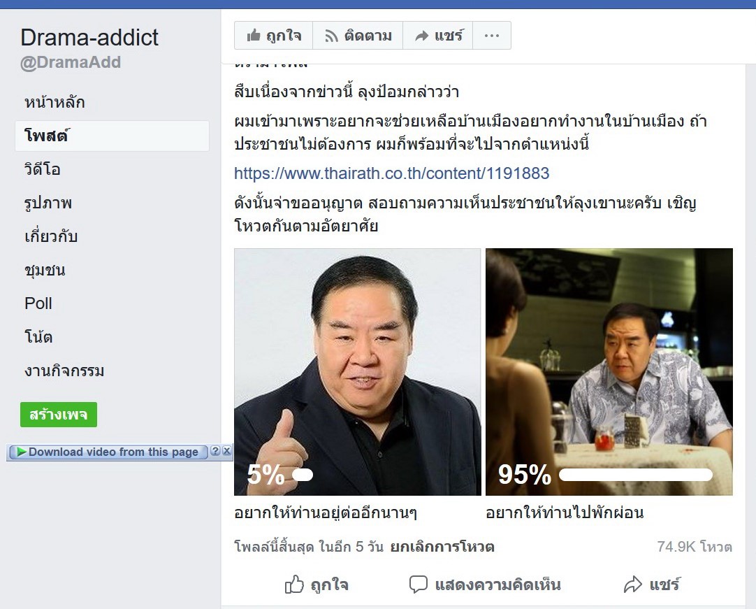 สำหรับในส่วนเพจเฟซบุ๊กอื่นๆนั้น ก็มีการทำโพลออกมาเช่นกัน โดยเพจเฟซบุ๊ก Drama-Addict ชื่อดังได้ทำโพลสำรวจว่า พล.อ.ประวิตร ควรจะอยู่ต่อนานๆหรือว่าควรจะไปพักผ่อน โดยใช้รูป Kent Chang ดาราฮ่องกงชื่อดังที่หน้าตาคล้ายกับ พล.อ.ประวิตร แทนรูป พล.อ.ประวิตร และเริ่มทำโพลตั้งแต่วันที่ 31 ม.ค. เวลา 15.16 น ปรากฏว่า ในวันที่ 2 ก.พ.เวลา 10.39 น. ก็มีผู้มาตอบคำถามจำนวน 74,900 คน เข้ามาโหวต โดย 95 % โหวตเรียกร้องให้ พล.อ.ประวิตรไปพักผ่อนเช่นกัน